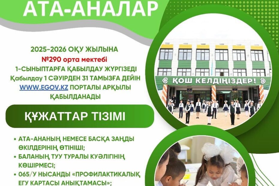 ҚҰРМЕТТІ АТА-АНАЛАР! 📢 №290 орта мектебі 2025-2026 оқу жылының 1-сыныбына…